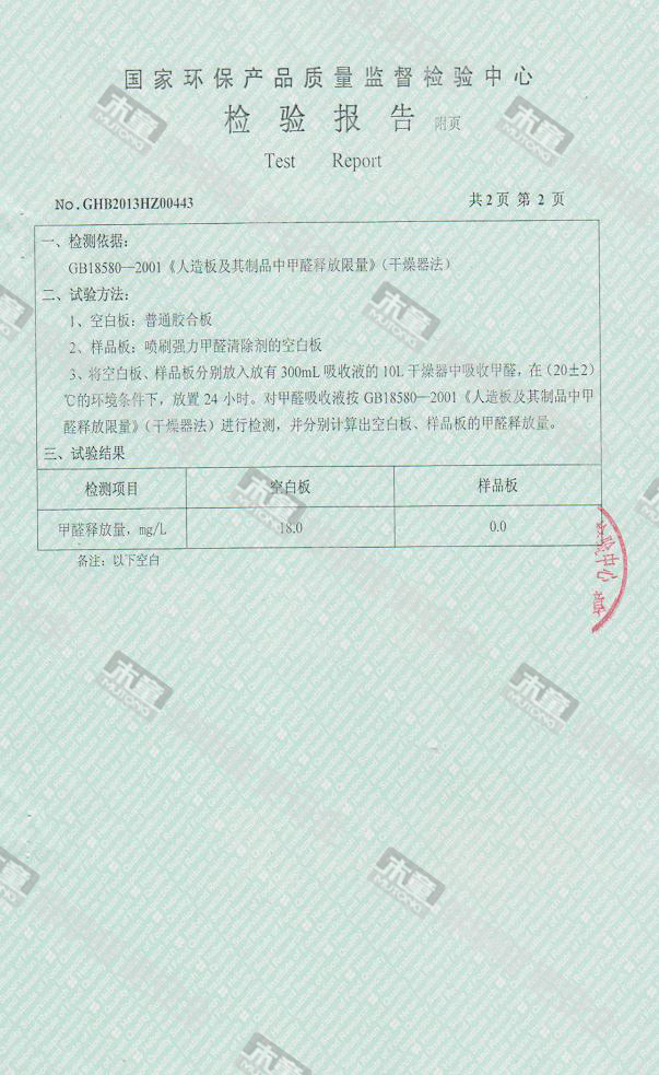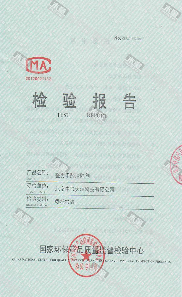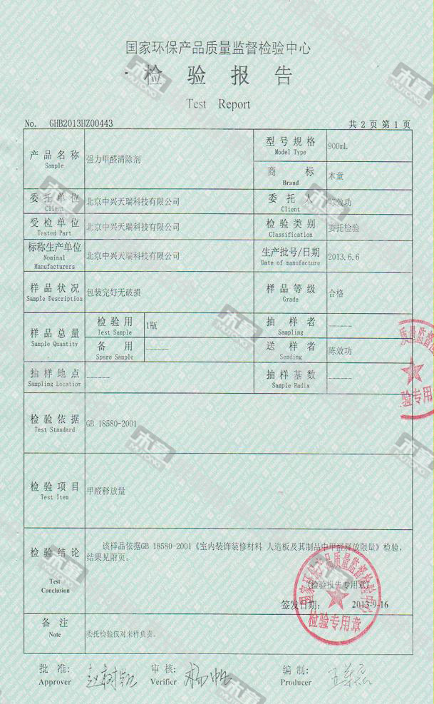 木童除醛2號(hào)三代效果檢驗(yàn)報(bào)告2013